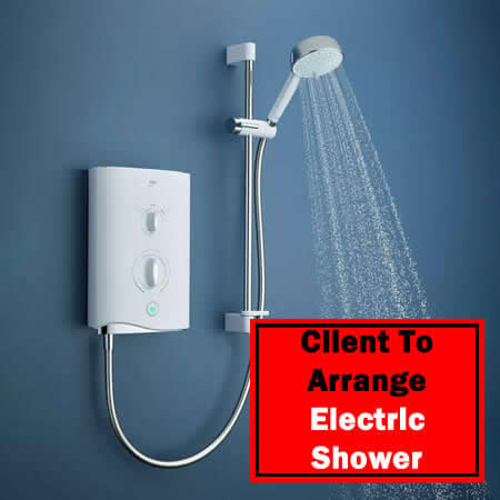 The client is to arrange purchase of the electric shower. The cost of the shower is to be met by the client. It is outside of the quote of the bathroom. There will be a charge for the electrician to fit of the shower.
