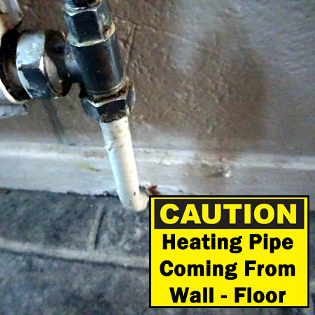The heating flow and return pipes appear to be coming from the bedroom wall- floor. Without opening up the bedroom floor it may not be possible to change the location of the heating pipes to match the new towel warmer. If we need to open the bedroom floor, we may have to charge if extra time is required to achieve this. Please note furniture and carpet would need to be moved. If the bedroom floor has a laminate covering, it may not be possible to move or change any of the heating pipe work in the bathroom.